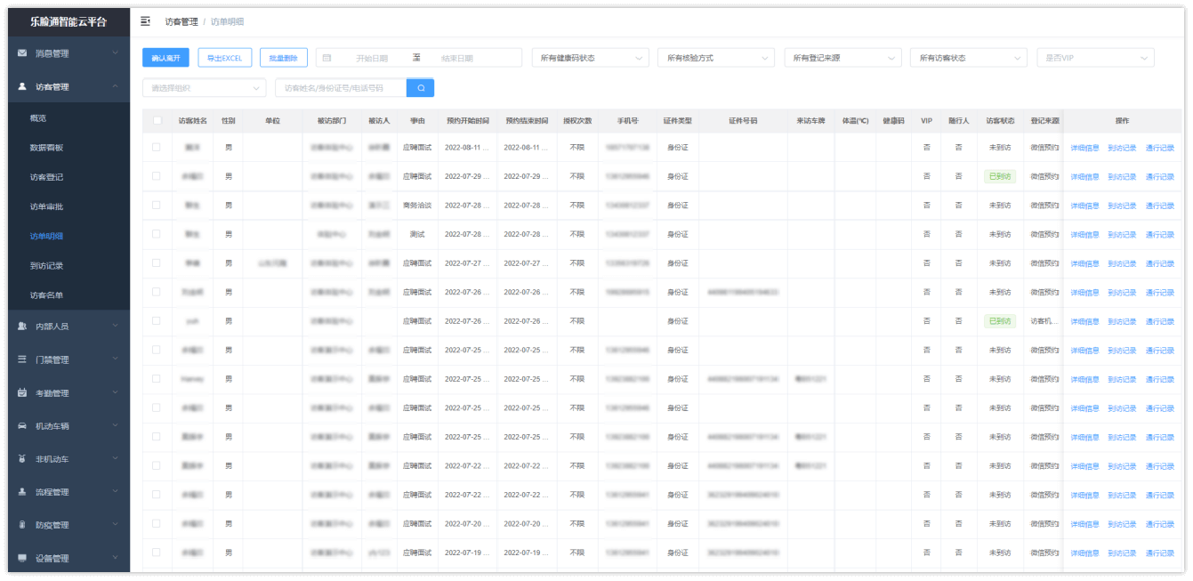可多維度篩選訪客登記記錄,查看訪客來訪狀態,支持導出,便于管理。