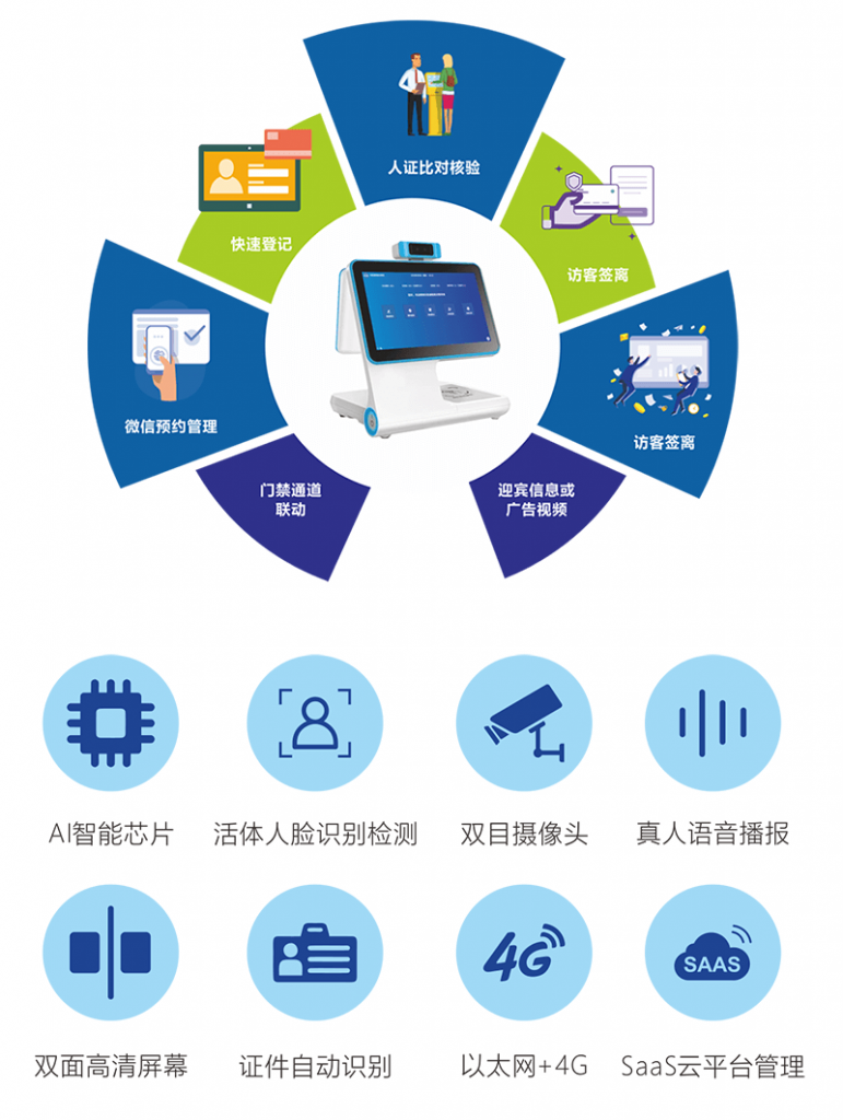 支持來訪人員的現場登記、快速登記、快速核驗、訪客記錄、訪客簽離等功能。